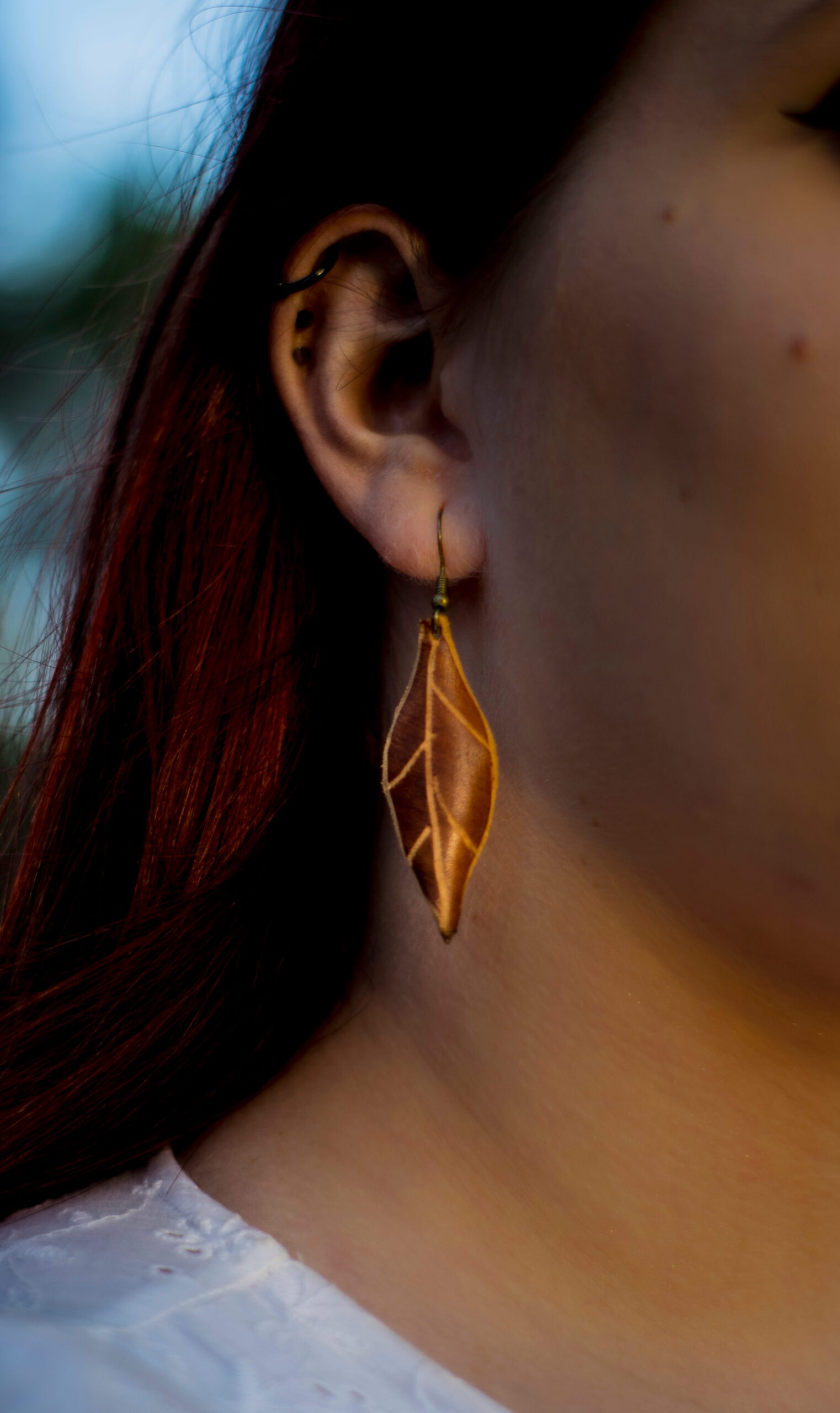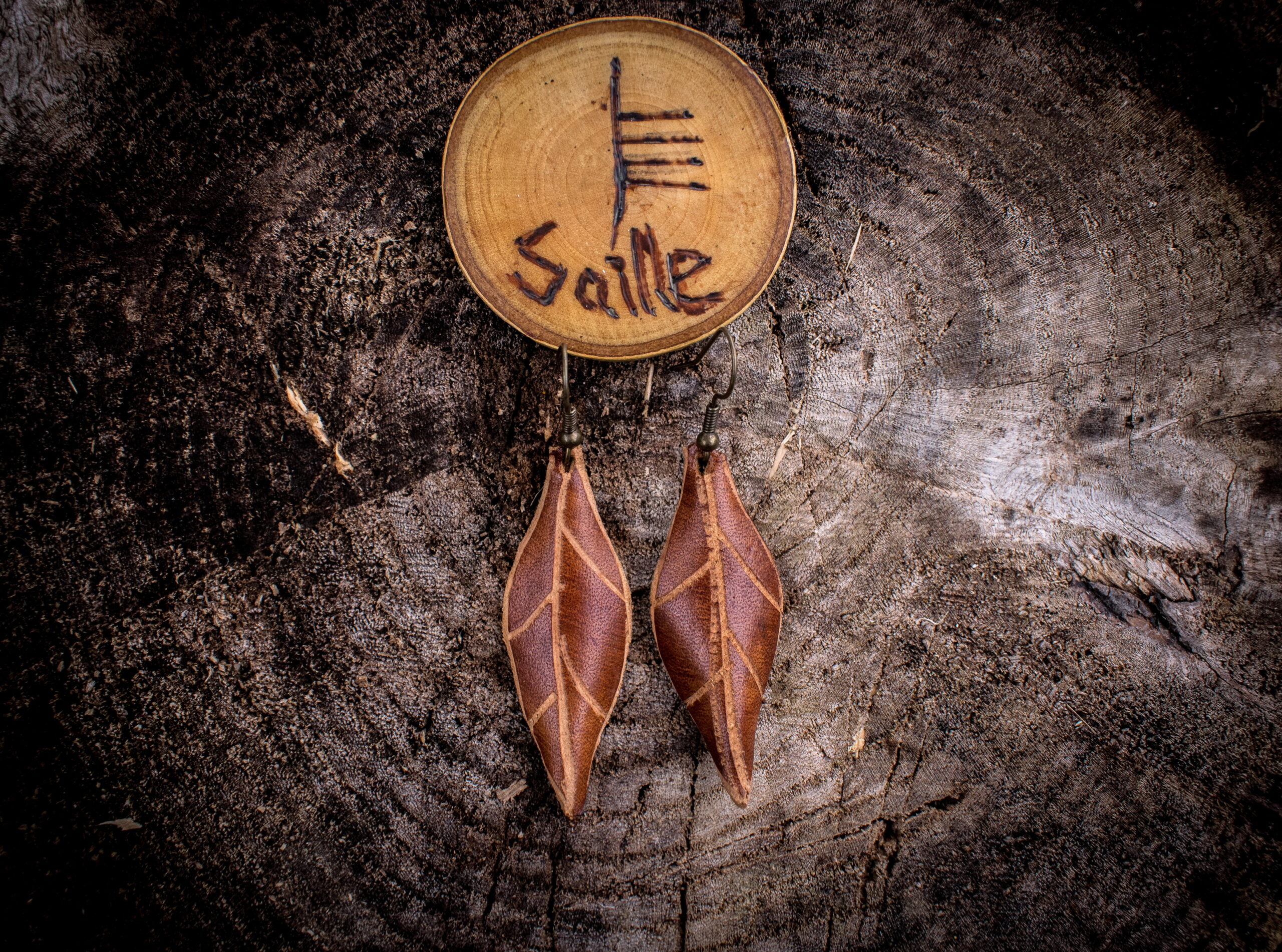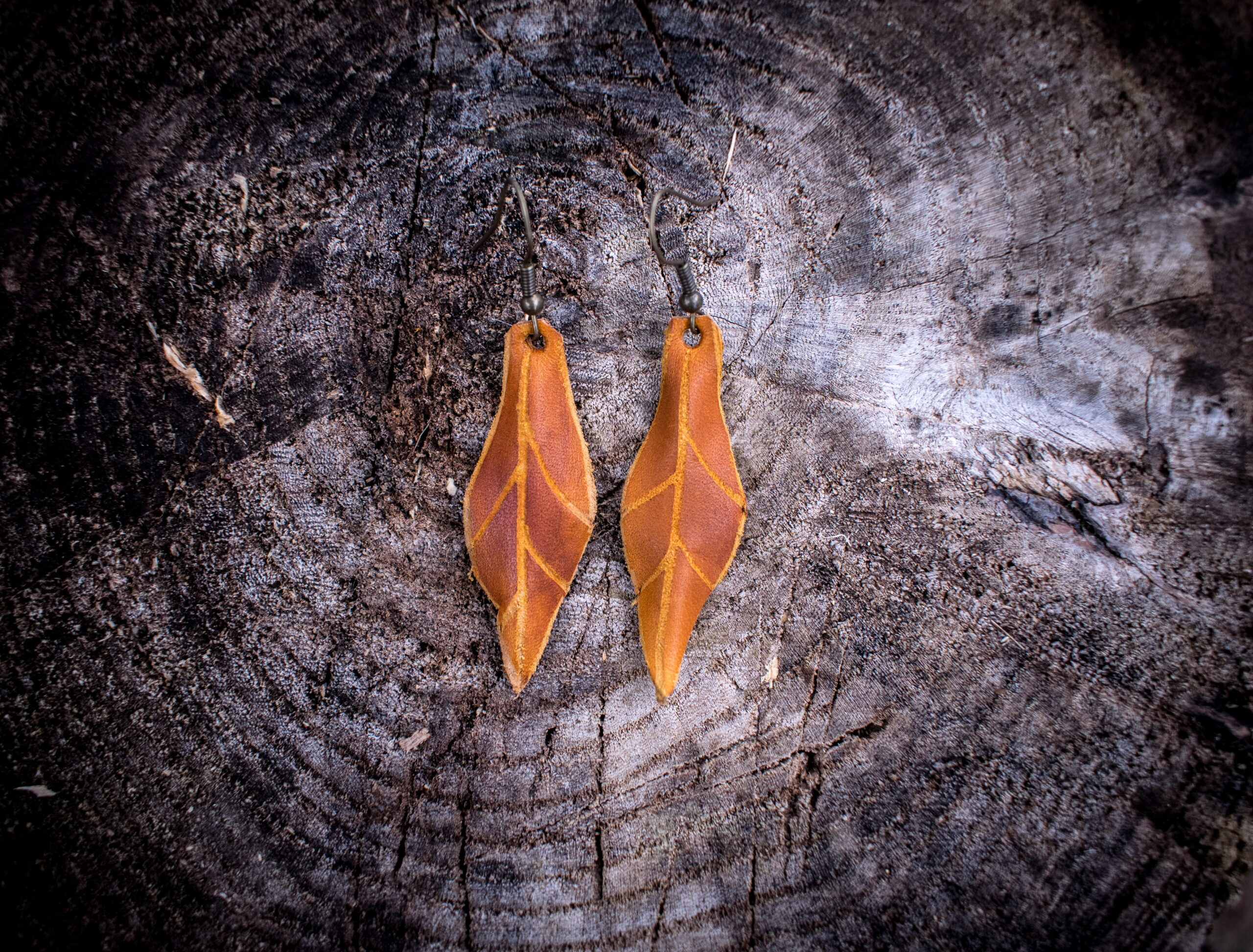 Boucles d’oreille en cuir, en forme de feuille de saule. Pour les créer, je m’inspire des vraies feuilles que trouve dans mes balades.