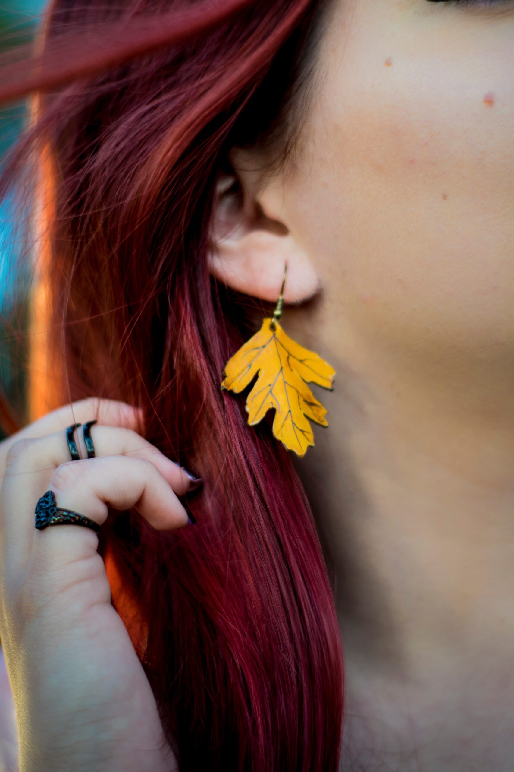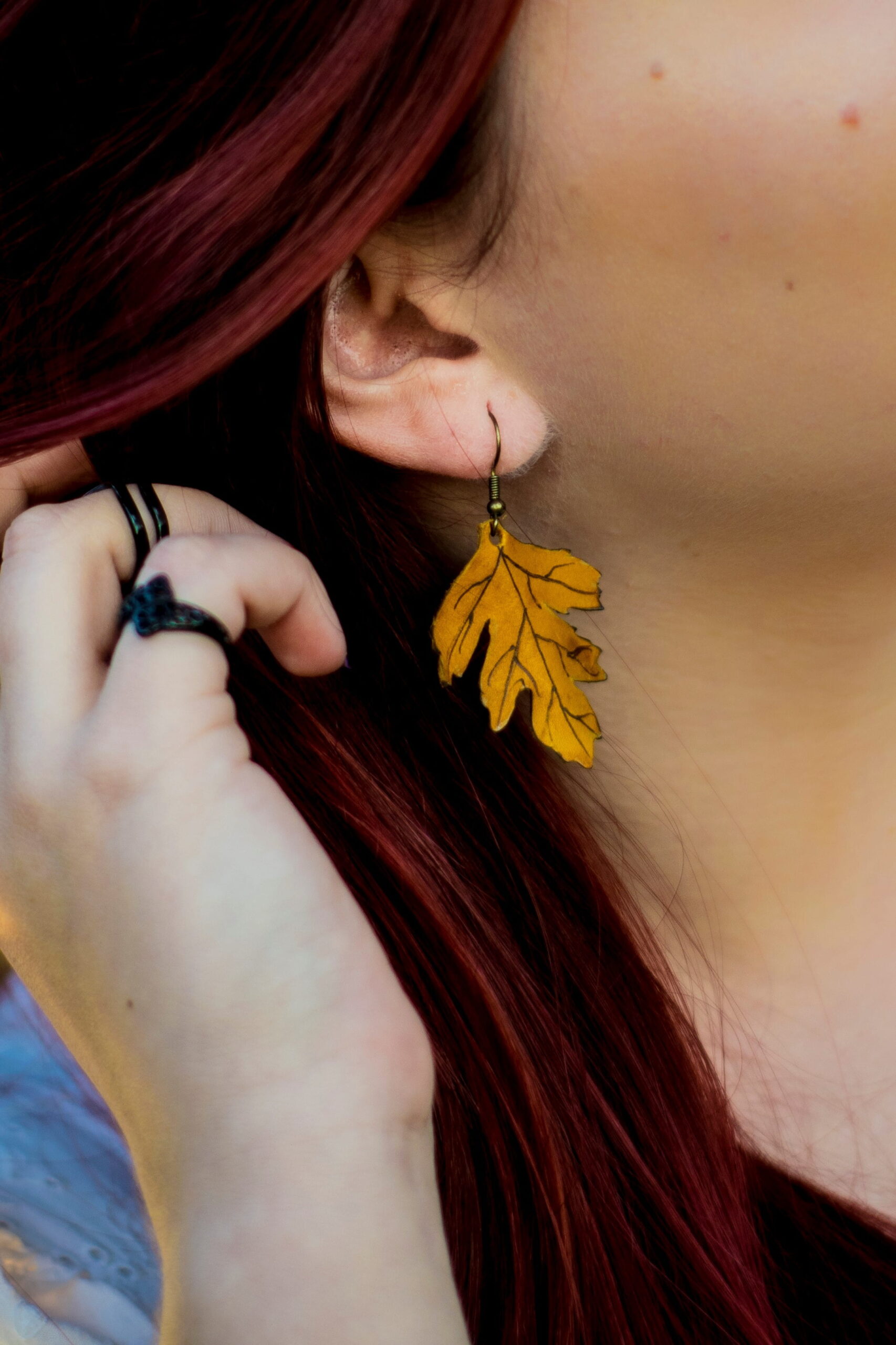 Boucles d’oreille en cuir, en forme de feuille d’aubépine. Pour les créer, je m’inspire des vraies feuilles que trouve dans mes balades.