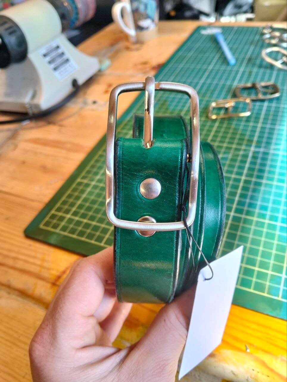 Fabrication 100% artisanale : découpe précise, traçage d’une ligne décorative, passage de l’abat-carre pour arrondir les bords, teinture des tranches et polissage mannuel au lissoir pour une finition belle et durable.